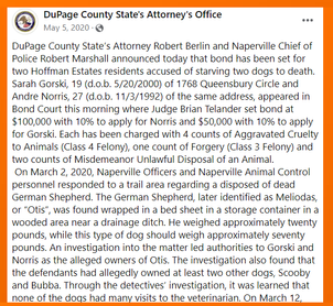 Robert Berlin, DuPage County State's Attorney said: “To say the charges against Sarah Gorski and Andre Norris are disturbing would be a gross understatement. Otis and Bubba both died a horrible, painful death, allegedly because these two defendants starved them to death. What’s even more disturbing is the allegation that the defendants fed Otis rat poison.”