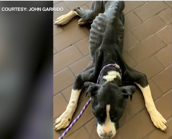 Outside of the property, police said there was a black and white Pit Bull “severely emaciated to the point of ribs and spine showing through his coat.”
