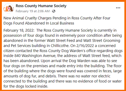 The organization said that on February 16, a concerned citizen contacted the Ross County Dog Warden’s office about “dogs inside 840 Washington Avenue, the address of Watt Street feed, which has been abandoned.”