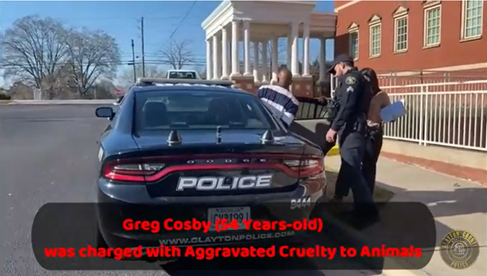 Clayton News Daily reports that COSBY was arrested on January 27, and charged with aggravated cruelty to animals.