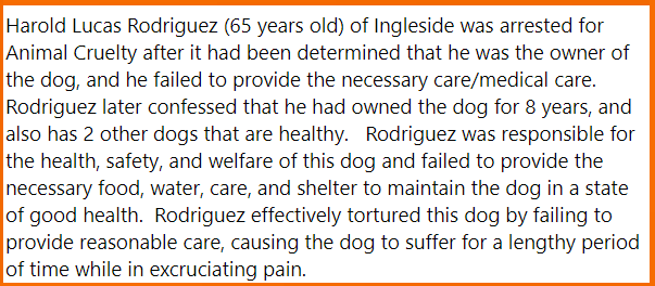 Furthermore, RODRIGUEZ “effectively tortured this dog by failing to provide reasonable care, causing the dog to suffer for a lengthy period of time while in excruciating pain.”