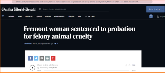 Although WINNERS was arrested on a class IV Felony punishable by 2 years imprisonment and/or $10,000 or both and could have faced pet ownership restriction, Dodge County District Judge Geoffrey Hall did not restrict her ownership of pets in his sentencing order!