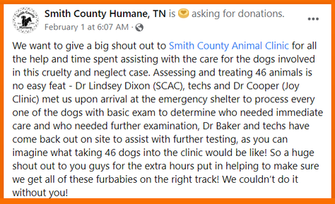 Through a Facebook post, the Smith County Humane expressed its gratitude to the clinic for all the help and time spent assisting with the care for the dogs involved in this case which has been called “Operation Worthy.”