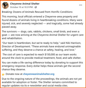 All of the poor souls were taken to the Cheyenne Animal Shelter (CAS) and its Director of Development, Niki Harrison, said: “Our team is heartbroken, but we’re ready to help. These animals have endured unimaginable suffering, and they deserve a chance at safety, healing, and love.”