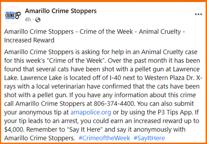 The Amarillo Crime Stoppers are reaching out to the public for assistance with an animal cruelty case in which several cats have been shot with a pellet gun at Lawrence Lake over the past month.