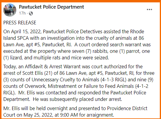 On April 15, 2022, detectives with the Pawtucket Police Department assisted the Rhode Island SPCA with an animal cruelty investigation at Apartment 5 on 86 Lawn Avenue, Pawtucket.