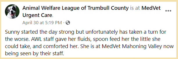 On the afternoon of Saturday, April 30, in a Facebook post the Animal Welfare League of Trumbull County said: “Sunny started the day strong but unfortunately has taken a turn for the worse.” Staff gave her fluids, spoon fed her, and comforted her.