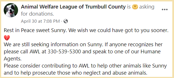 The Animal Welfare League of Trumbull County said: “Rest in Peace sweet Sunny. We wish we could have got to you sooner. 💔”