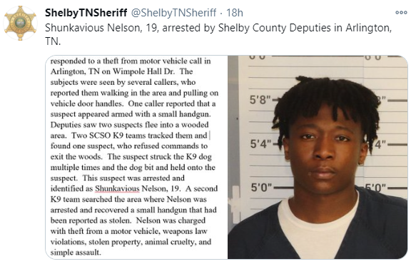 The K9 held onto the suspect identified as 19-year-old SHUNKAVIOUS NELSON (pictured below).