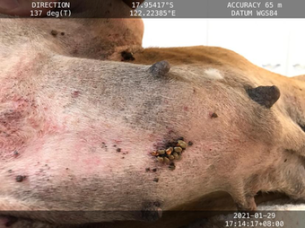 Bobbi was examined at the Broome Veterinary Clinic and she was found to be "suffering a severe tick infestation with thousands of ticks on both ears at different life stages, and hundreds of ticks over the rest of her body.