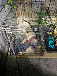 In the fenced-in backyard, the detective found a medium-sized brown and white Pitbull mix with a red collar, and a medium-sized brown Frenchie inside their metal crates with locked doors. In each crate there was an empty bowl and there was no sign of any food.