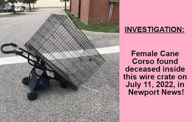 Upon arrival, officers found a lifeless female Cane Corso inside a wire crate.