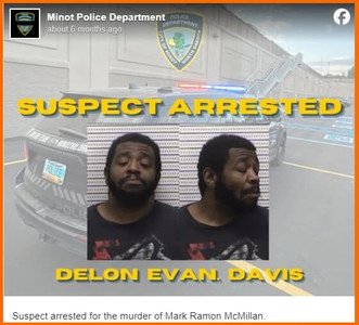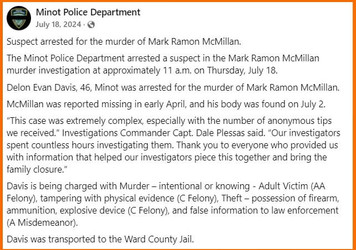 On July 18, 2024, DAVIS was arrested by the Minot Police Department for the murder of Mark Ramon McMillan.