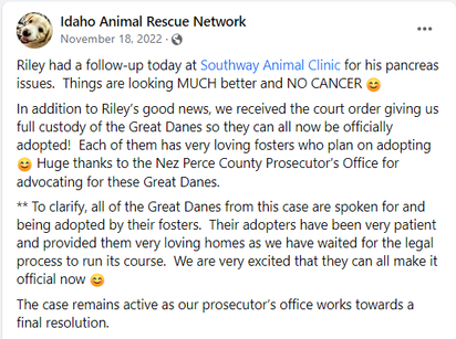 On August 3, 2022, the Nez Perce County Sheriff's Office executed a search warrant at the Lewiston home and with the assistance of the Lewiston Fire Department, twelve more Great Danes were removed bringing the total number to twenty-five.