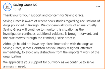 WRAL reports that JAMES DAVID GOLDSTON III was a donor and board member of the dog rescue Saving Grace. Part of the nonprofit’s Facebook post published this past Saturday on their page read: “Saving Grace is aware of recent news stories regarding accusations of dogs poisoned in Raleigh. We condemn all forms of animal cruelty. Saving Grace will continue to monitor this situation as the investigation continues, additional evidence is brought forward, and the case moves through the criminal justice process. Although he did not have any direct interaction with the dogs at Saving Grace, James Goldston has voluntarily resigned, effective immediately, to avoid any distraction from the important work of the organization.”