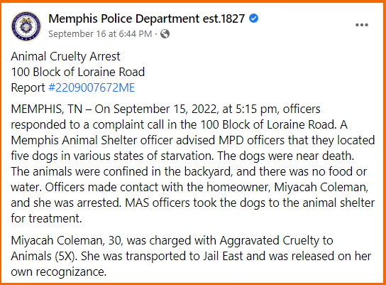 “Cruelty To Animals Title 21 1685 (1) Willfully/maliciously, by abandoning; (2) caused; (3) any animal in captivity, by confining to the back yard area of the residence; (4) (to be) tortured/maimed/(deprived of necessary food, drink, or shelter), by not providing any available food, water, or shelter. And the yard area to be left covered in animal feces and in an unhealthy environment. Also both dogs were not provided necessary medical care, which caused both to be covered in ticks. The male brindle to getting worms and the female, black in color, reaching such an unhealthy stated, which led to her having to be euthanized.”