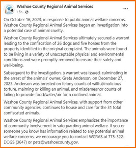 Washoe County Regional Animal Services encourages anyone who has information related to any potential animal welfare concerns to contact them at 775 - 322 - DOGS (3647) or pets@washoecounty.gov. Thank you!