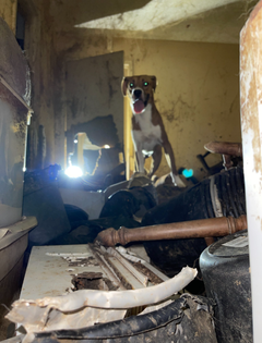 Inside, the remains of dead dogs are scattered throughout the home. Bones by where the buckets were pushed in through the crack in the door speak to a desperate fight for survival. There are mothers who have given birth recently, but no surviving puppies. The surviving dogs are gentle and terrified, blinking from the sudden light from our spotlights and in desperate need of medical, physical, and emotional care.”