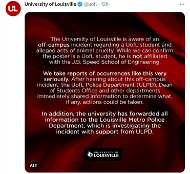 Part of the tweet reads: “After hearing about this off-campus incident , the UofL Police Department (ULPD), Dean of Students Office and other departments immediately shared information to determine what, if any, actions could be taken. In addition, the university has forwarded al information to the Louisville Metro Police Department, which is investigating the incident with support from ULPD.”