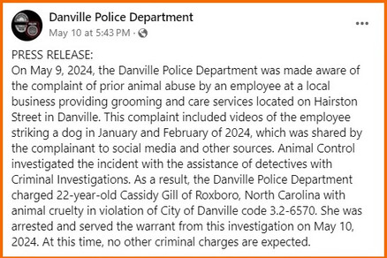 The arrest follows a distressing video that was recorded by a former employee of Hollywood Pets on Hairston Street in Danville and showed GILL, who was also employed at Hollywood Pets, hitting dogs and cursing at them.